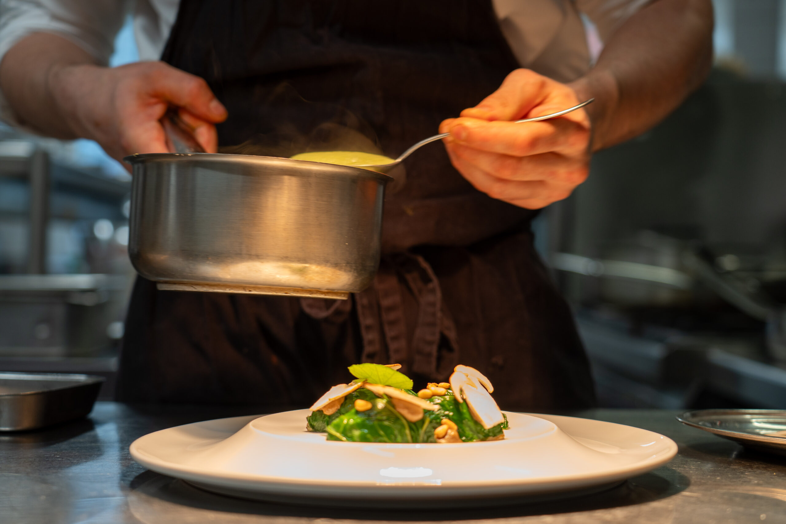Quenelles de blettes aux bolets et pignons de pin, bouillon végétal aux feuilles de capucines.